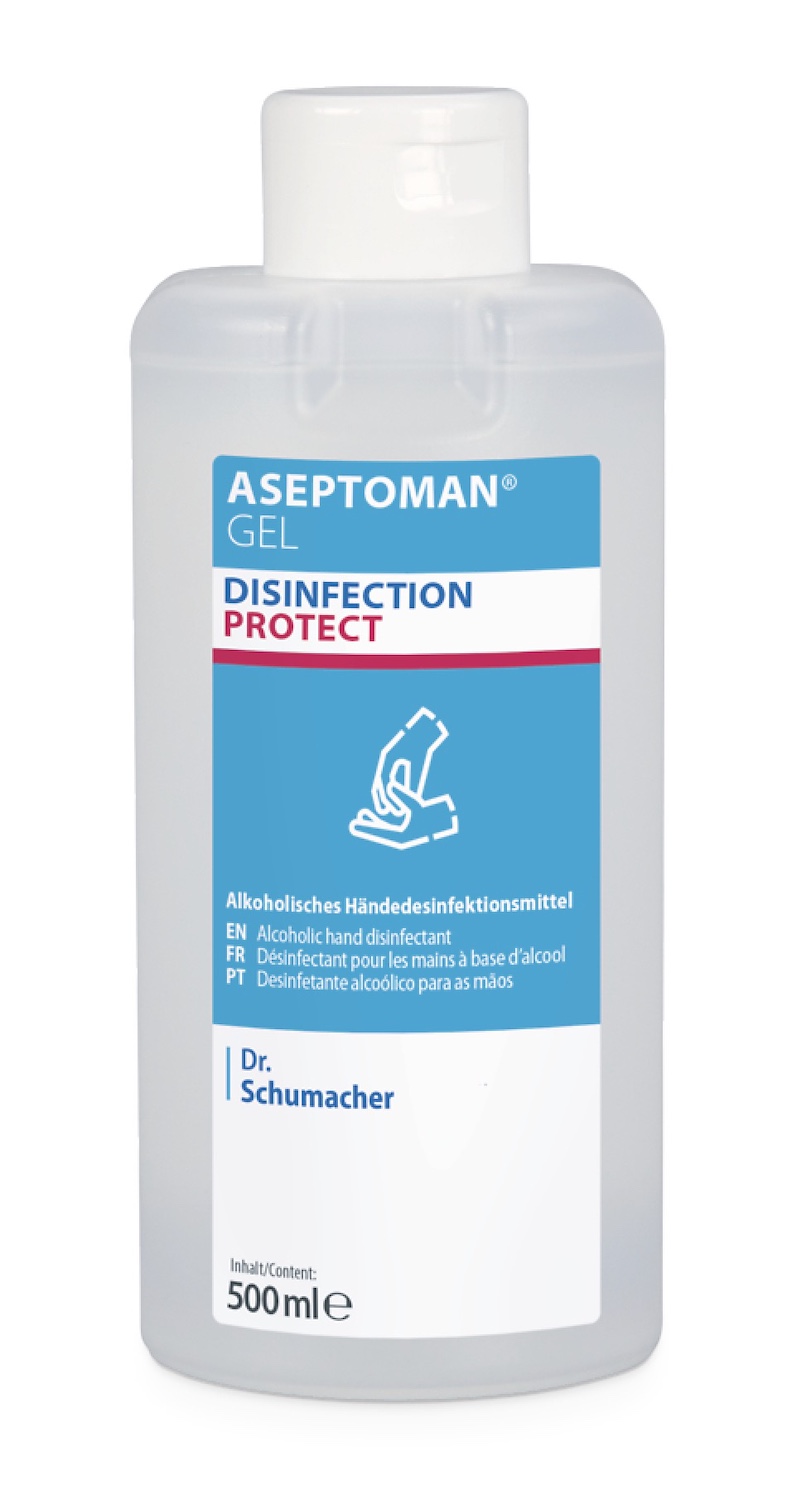 Aseptoman gel - alkoholový dezinfekční gel, který se vtírá do pokožky rukou. Gelový roztok umožňuje přesné dávkování a jednodušší aplikaci bez stékání. Kompatibilní se všemi mycími roztoky.