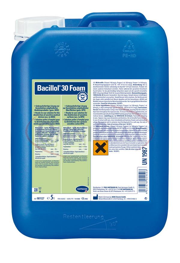 Bacillol 30 Foam je zejména vhodný na rychlou dezinfekci citlivých povrchů, jako jsou např.: *zdravotnické pomůcky a vybavení specifikované zákonem o zdravotnických prostředcích (MDD) *citlivé syntetické povrchy jako jsou syntetická kůže, Makrolon®, akrylové sklo a polysulfone *pracovní plochy na klinikách, primární zdravotní péče, zubní chirurgie a sanitky *oblasti, které vyžadují rychlý účinek, například výrobní linky *oblasti těžko přístupné, jako jsou ventily, displeje, monitory, klávesnice, ovládací panely apod. *solária