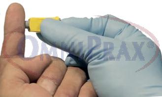 Lanceta je sterilní a její ostří je chráněno před i po použití, nehrozí zranění personálu infikovanou krví.