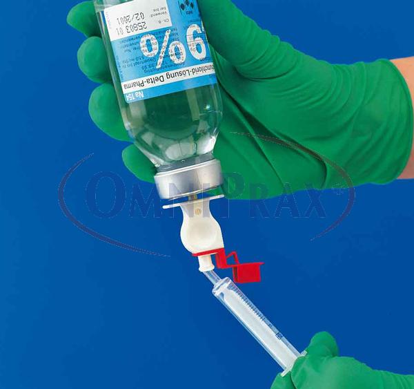 Sterilní systém s víčkem, které uzavírá přístup do zásobní lahve, roztok zůstane delší dobu použitelný.