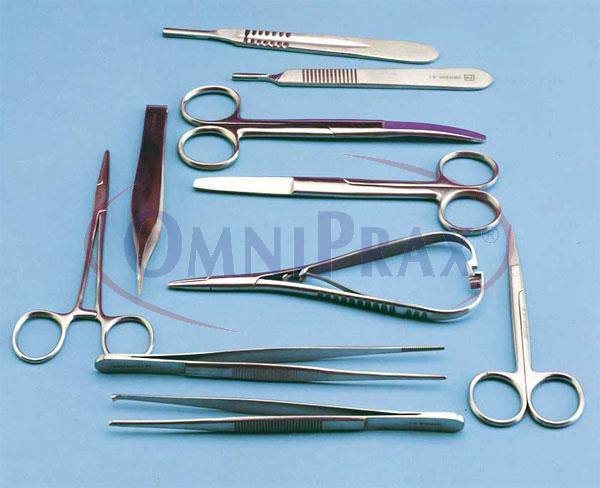 Souprava obsahuje 9 nástrojů: jehelec, chirurgické nůžky rovné, nůžky na stehy, chirurgické nůžky zahnuté, pinzeta na úlomky, chirurgická pinzeta, anatomická pinzeta, 2 držáky skalpelů.
