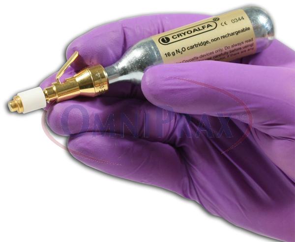 Moderní kryoterapeutický přístroj používá ocelové lahvičky s čištěným a filtrovaným N2O lékařské kvality.