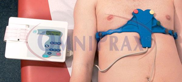 Pás se umístí na hrudník pacienta, konektor se připojí k EKG přístroji.
