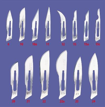 Sterilní skalpely. Jsou jednotlivě baleny a jsou určeny k jednorázovému použití. Dodávají se v balení po 10 kusech.