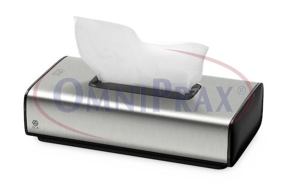 Nerezový zásobník na kosmetické ubrousky. Pěkný design, snadné otevírání a doplnění nové náplně. Umístění na umyvadlo i zeď. Jemné, zaoblené povrchy, jednoduché čištění. Povrch zásobníku je minimalizován, redukuje se tak riziko křížové kontaminace.